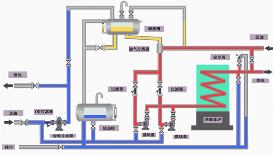有机热载体炉是以烟煤、轻油、重油、可燃性气体、废木料、砂光粉为燃料,导热油或熔盐为热载体,通过循环泵强路液循环将热能输送给用热设备,继后返回加热炉再加热的直流式特种工业炉,有着其它工业炉不能比拟的工艺特点: